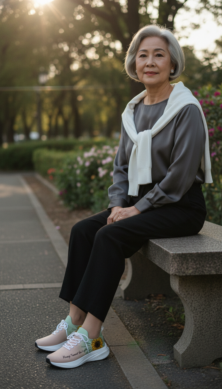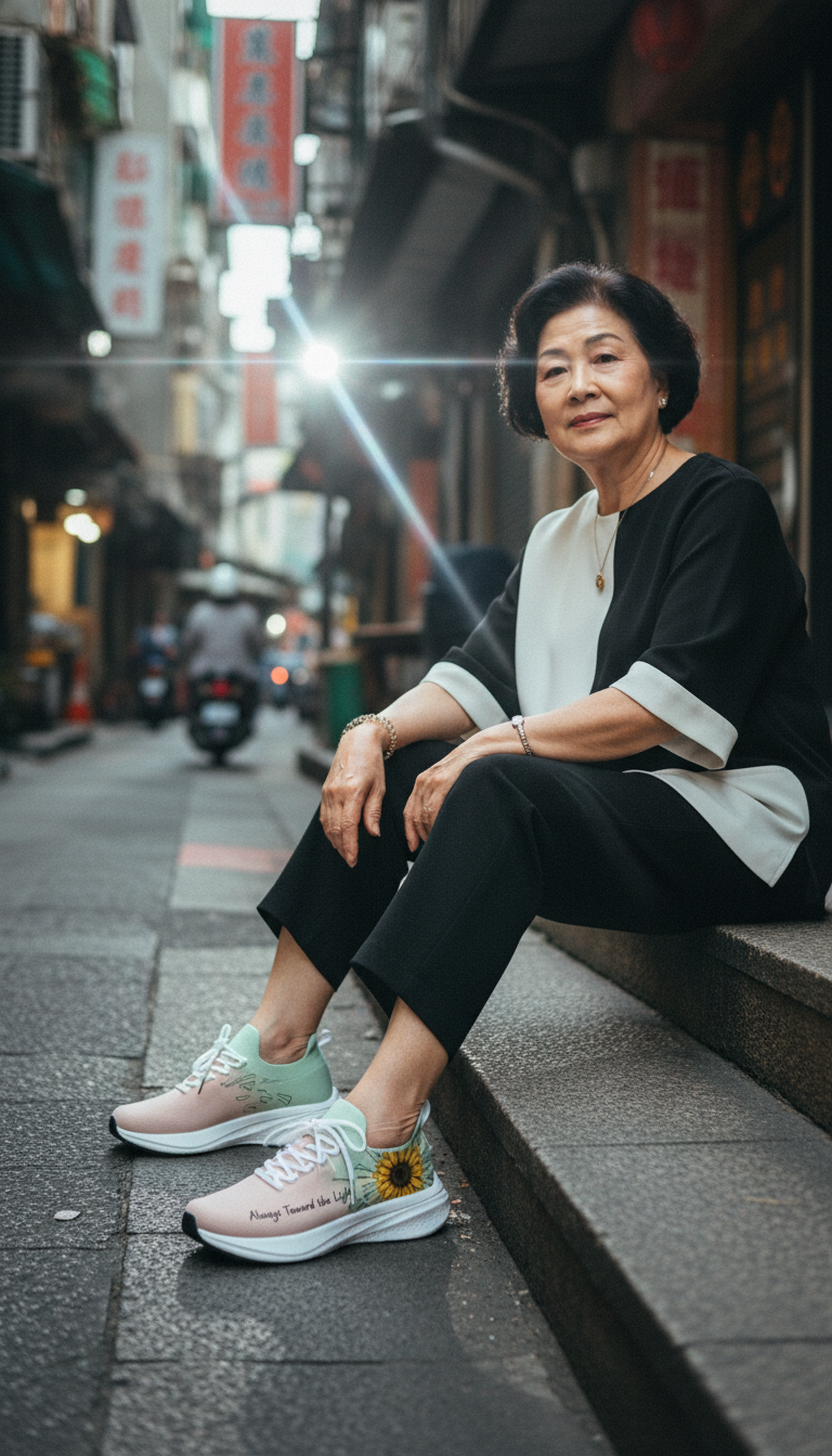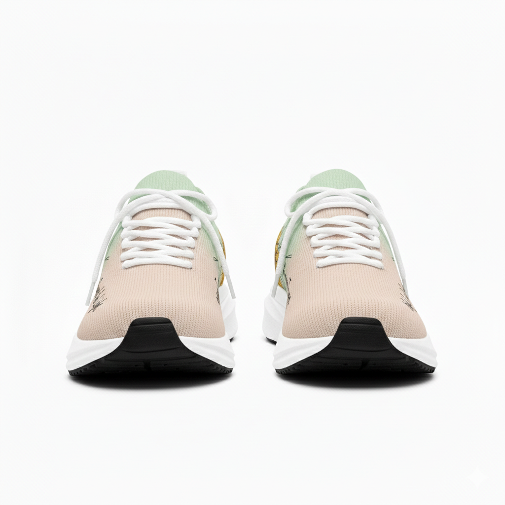 視覺聚焦於鞋側大面積的「金黃向日葵」與清新的「果綠色漸層」。金黃色能瞬間點亮視覺感受,展現出活力與朝氣;果綠色則營造出春